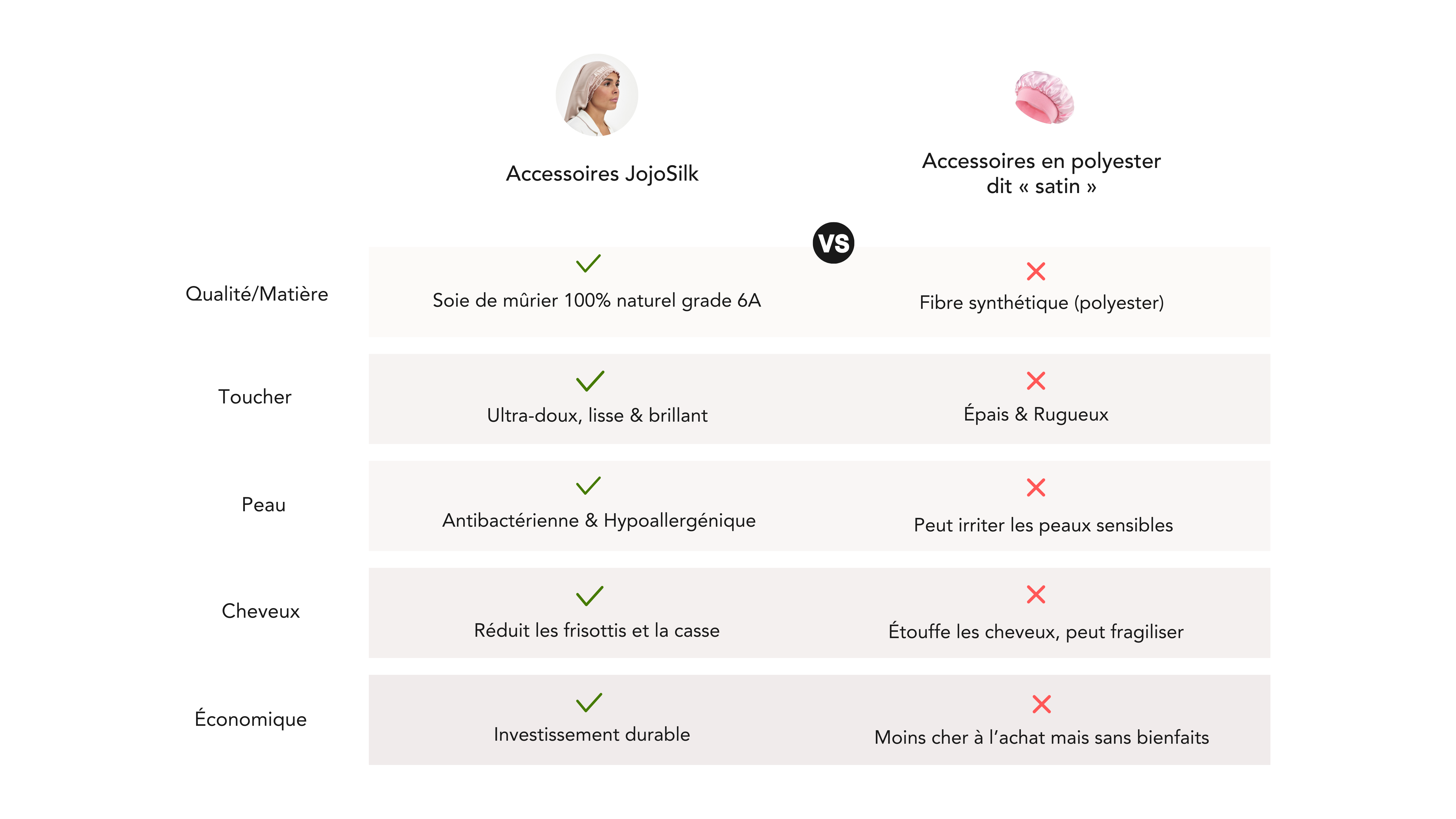 Fini les accessoires en satin de polyester sans bienfait ! Le satin, c’est juste une manière de tisser et souvent c’est en polyester donc ça n’apporte aucun vrai bienfait, au contraire. Le plus important c'est la matière.
